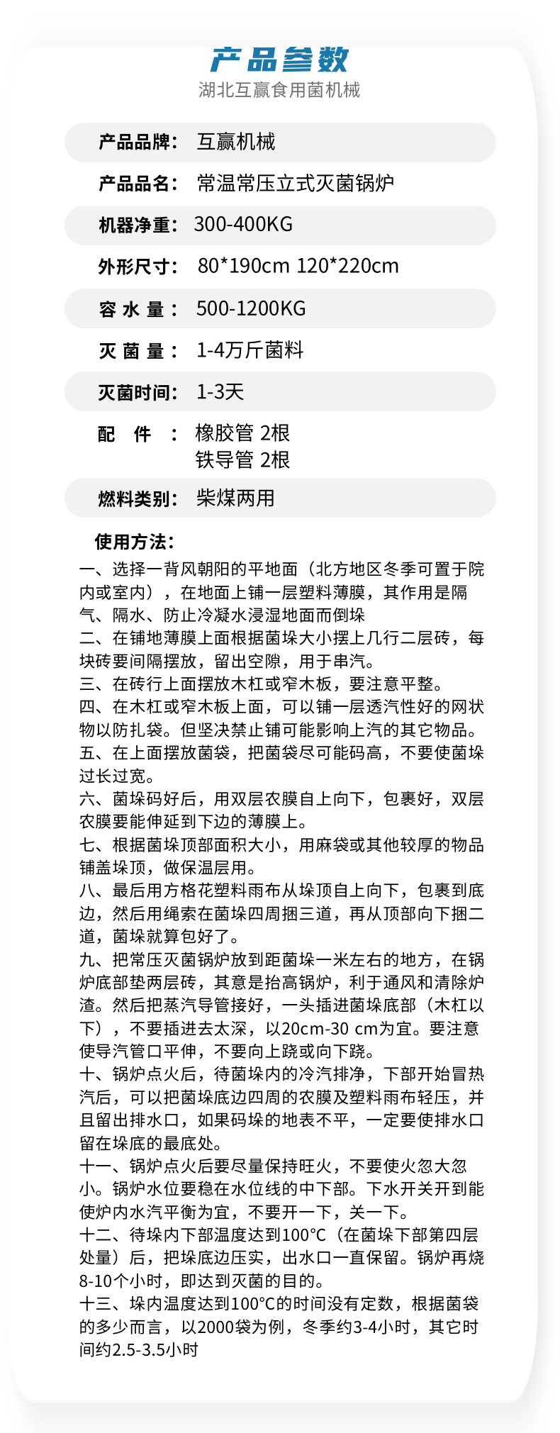 食用菌生產(chǎn)機(jī)械化技術(shù)的主要內(nèi)容是以樹枝、修剪條、鋸木屑和刨花、玉米芯、玉米稈、麥秸、稻草、花生殼、棉籽殼等為主要原料,經(jīng)機(jī)械加工成碎屑狀,添加一定的輔助材料,如麥麩、米糠、豆餅、花生餅、蔗糖、石膏、碳酸鈣、硫酸鎂等,經(jīng)機(jī)械制種、制袋、滅菌、接種、栽培、采收、加工,形成一整套機(jī)械化生產(chǎn)和栽培的技術(shù)規(guī)范。 食用菌常壓滅菌爐滅菌工藝。滅菌工藝一般分高壓滅菌和常壓滅菌。高壓滅菌主要用于制作母種、原種...